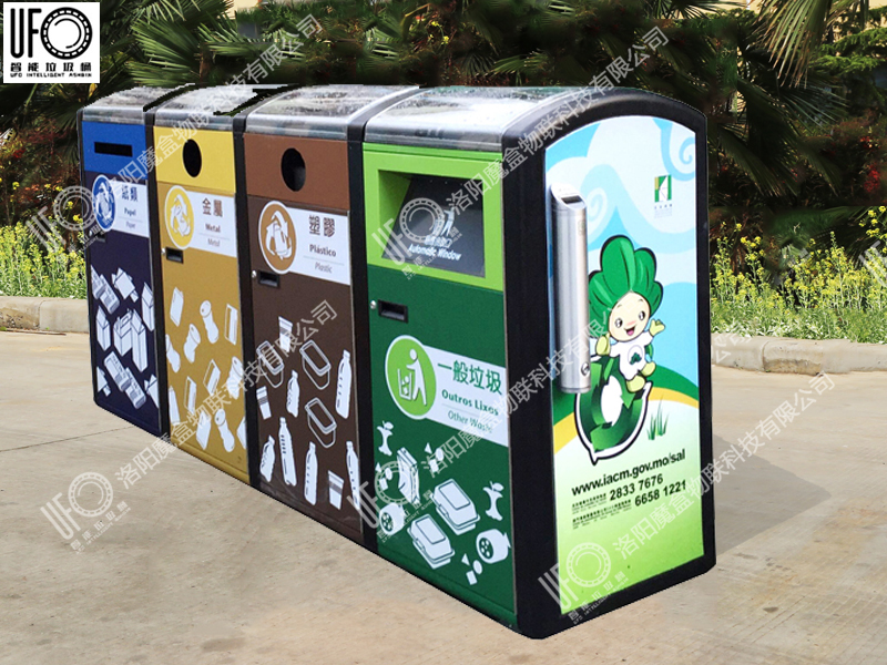 垃圾箱通過(guò)不同投放口進(jìn)行垃圾分類引導(dǎo),內(nèi)部設(shè)有壓縮系統(tǒng),用箱頂?shù)奶?yáng)能電池板供電,可自動(dòng)對(duì)投入的垃圾進(jìn)行壓縮。